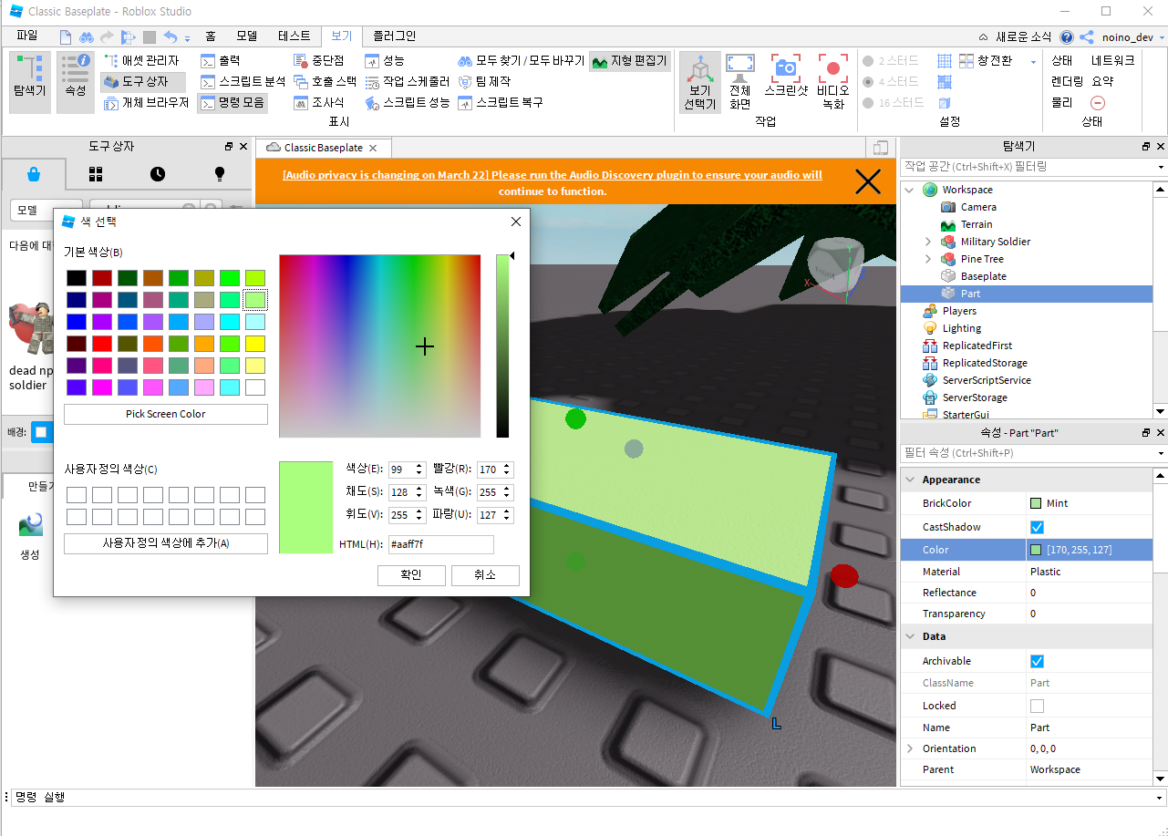 세번째 속성인 팀 색상 (TeamColor)은 색상으로 팀을 구분하게 하는 것으로, 팀 변경하기와 함께 사용하는 기능이다.