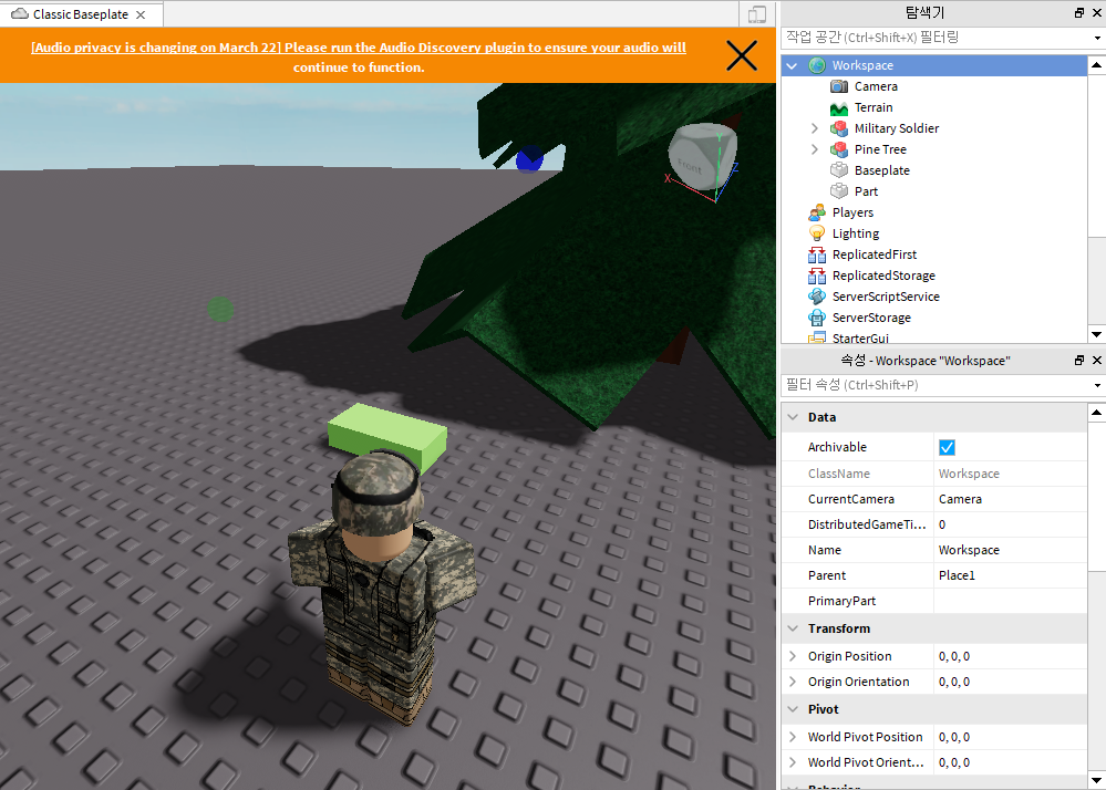 캐릭터의 시작 위치를 결정하는 스폰로케이션 파트는 오른쪽에 있는 Workspace를 눌러 추가할 수 있다.