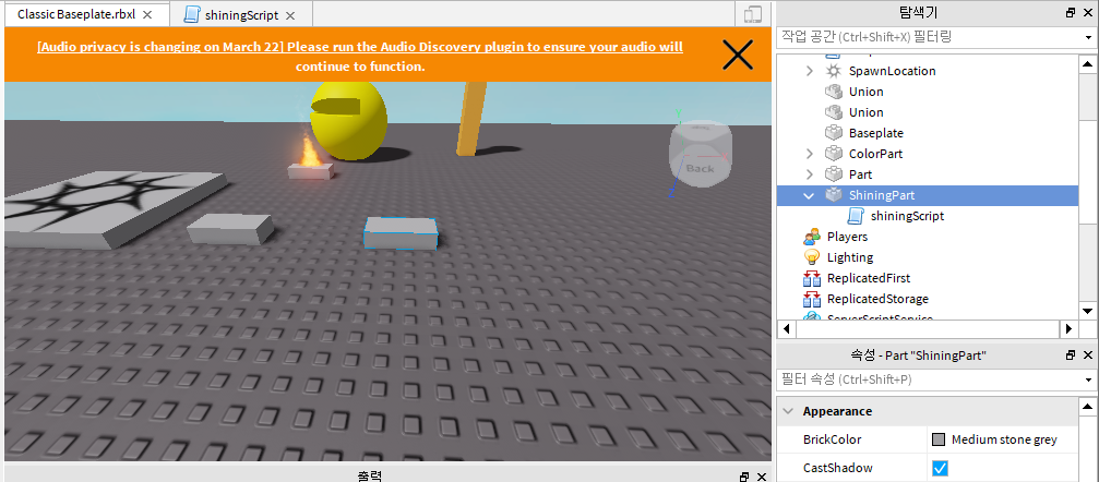 'ShiningPart'라는 파트 하나와, 그 아래에 ShiningScript라는 스크립트를 생성해준다.
